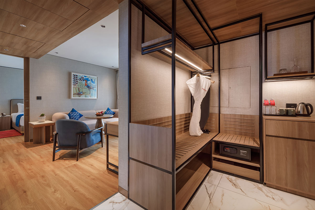 The Junior Suite features a well-defined living area, plush bedding, and contemporary furnishings, creating a perfect setting for relaxation and productivity. With enhanced amenities and stylish décor, every detail is curated to provide a premium stay experience.